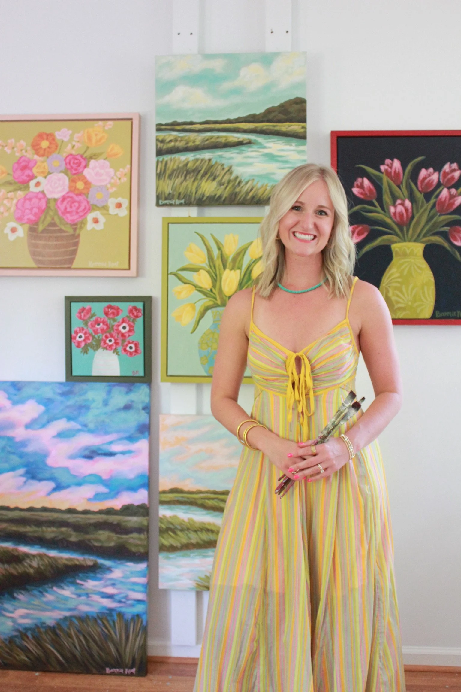 I am a self-taught artist with a passion for color. What started as a fun side hobby and Christmas art shows hosted at my house has turned into a rewarding business. I find inspiration in vibrant colors, my love for the coast, and the things that bring us the most joy, our pets. I love bringing happiness into peoples’ homes by painting the special things in their life.